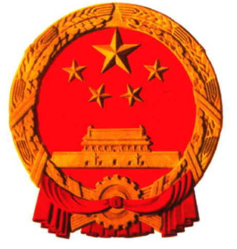 中華人民共和國國徽,中間是五星照耀下的天安門,周圍是谷穗和齒輪。