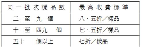 前條之收費標準係指該檢測項目於同一批次僅委託一個樣品之標準。若同一批次委託兩個以上樣品時,依左表計算之: