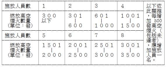 ﹝2﹞ 前項之施放人員,應依施放之高空煙火數量,按下表規定配置:■