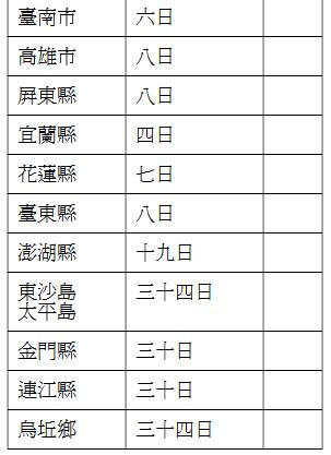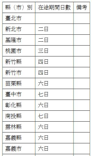 ﹝1﹞再審議聲請人居住於臺灣地區者,其在途期間之標準如下表:▼