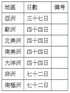 ﹝2﹞再審議聲請人居住於國外地區者,其在途期間之標準如下表:▼