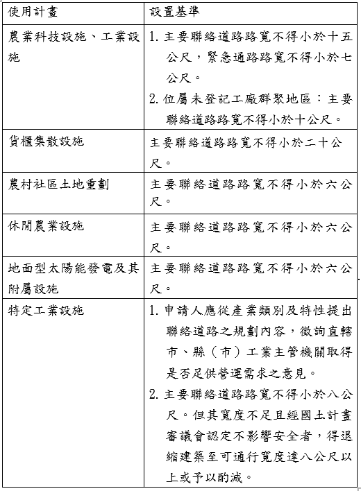 ﹝1﹞ 申請案件應至少設置二條聯絡道路各自連結聯外道路,其中一條作為主要聯絡道路,另一條作為能容納消防車通行之緊急通路,並應符合下表設置基準;下表未列之使用計畫,其主要聯絡道路路寬不得小於八公尺:■