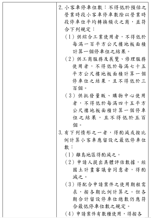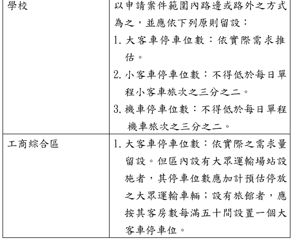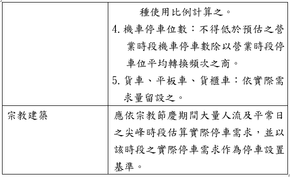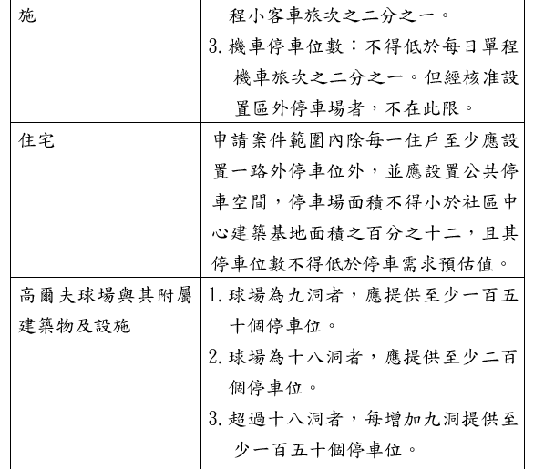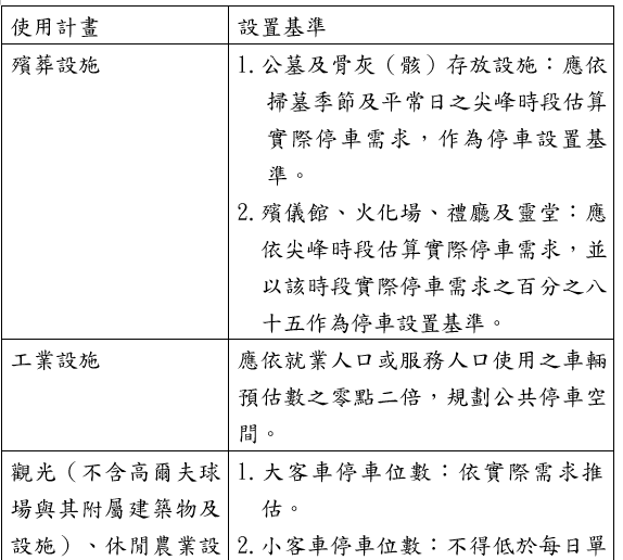 ﹝1﹞ 申請案件應依推估衍生之尖峰小時停車需求設置公共停車空間,並應符合下表設置基準:■